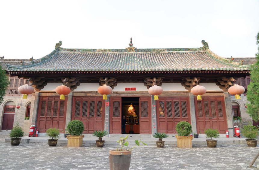 正殿始建于北宋元祐二年(1087年),金泰和五年(1205年)重修,面阔五间,进深六椽,单檐悬山顶。前檐施抹八棱石柱六根,侧角收分明显。明间两根石柱为金泰和五年(1205年)重修时更换,其余四根为北宋元祐二年(1087年)原物,柱头卷杀柔和。六根石柱头均有捐施题记,为该殿的建筑年代提供了依据。