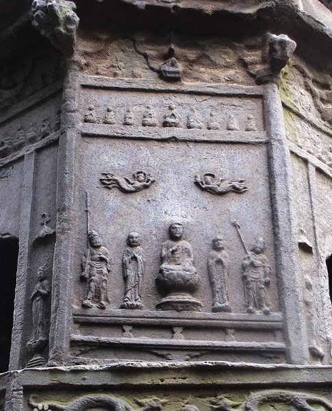现在的北固山铁塔还有四层,高约8米,基座及一、二层是宋代所铸,三、四两层为原塔的五、六两层,系明代所铸,铁塔呈楼阁式,八角形。塔身八面四门,每面都有形态各异的佛像和飞天造型。第四层塔身上有铭文,铸有“奉政大夫”“承直郎”“文林郎”等明代文官称谓。在塔身上还有诸如云水纹、游龙戏珠等图案纹路,在塔的东南面还可以辨别出“国界安宁”等字。这些精致的铭文和雕塑造像工艺彰显着这座铁塔所具有的艺术价值,而且也印证了我国古代铸铁技术的精湛和高超。