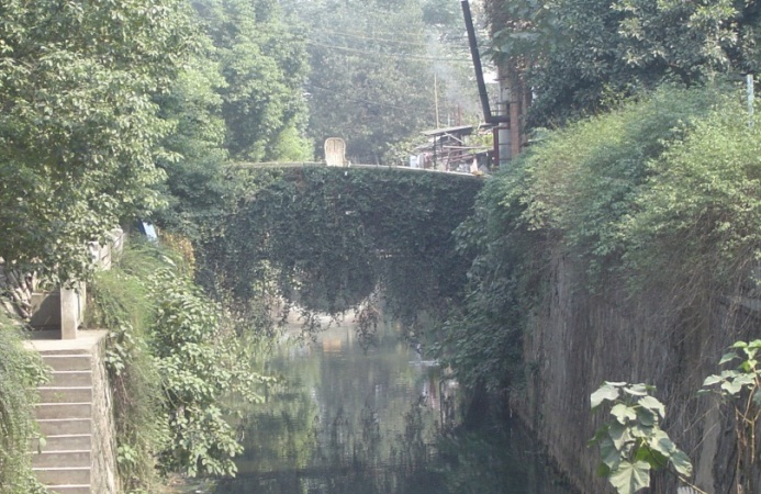 忠义桥为单孔圆弧形石拱桥。两桥坡皆以长条青石铺筑成十三级踏跺,桥面正中筑素面方形平台。忠义桥拱板上,有题记提到“嘉定戊寅”,即嘉定十一年。它告诉我们,忠义桥已经历了800多年的历史沧桑。难得的是,忠义桥除桥面板和栏板有所更换外,桥身材料、结构基本保持了原先的模样。