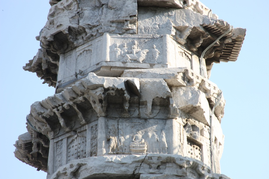 从形态看,白塔完全模仿木结构楼阁式塔形制,按比例缩小,全用白石精工雕琢砌叠而成。外观八面九层,逐层收分,比例适度,出檐深远,起翘舒缓,轮廓挺拔秀美。每层有腰檐和平座,顶置铁塔刹。塔身四周遍刻经文,门两侧浮雕佛像、菩萨像,线条纤柔,形象逼真。塔基下为磐石,上为须弥座。座身各面都刻满经文,座上置塔身。塔的最下边是基座,雕刻有山峰、海浪等纹饰,象征着“九山八海”,其上立有须弥座。塔座的束腰上刻有佛经,再上分为九层,每层由塔身、塔檐和平座三部分组成,塔身上浮雕有佛、菩萨等,人物形象刻画生动,惟妙惟肖。