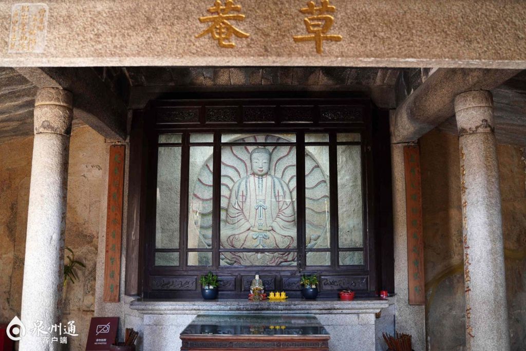 悬在岩壁上的三开间小石室,典型的闽南红砖外墙,不大却精巧,庵前一片赏心悦目的绿色,没有金碧辉煌却显清幽别致。走进草庵,听着晋江市文保中心主任吴金鹏娓娓而谈,草庵的前世今生犹如电影,一幕幕缓缓出现。