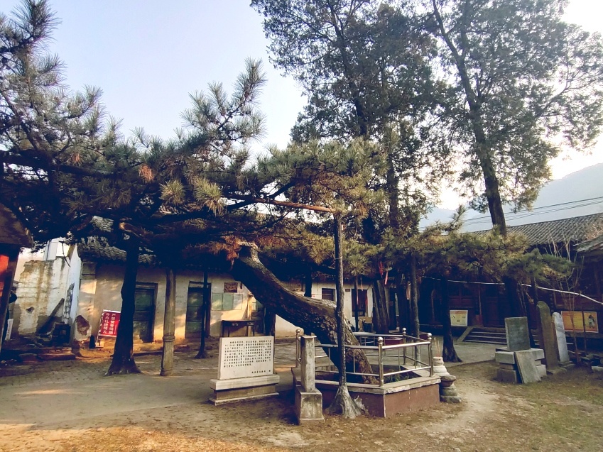 松云寺内的古松,虽历经风雨寒暑考验,但一直繁茂葱郁。据史料记载,这棵古松的树龄在2000年以上,枝干蜿蜒曲折,向东北方向平行生长,树枝之间扭曲成一片,两根枝丫盘旋交错,如苍龙翻腾,似云海缠绕,覆盖院内空地。