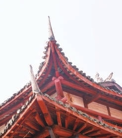 圣旨坊是寺内唯一庑殿顶的建筑物,也是四川省保存最好的一座明代木牌坊。虽然只有三开间,却用了七踩斗拱,并置于天王殿前的中轴线上,足见其地位非凡。圣旨坊将屋顶放在柱与枋组成的坊身上,利用斗拱把屋顶向外托起,巧妙地将屋顶的重心集中在屋顶的正下方,使支撑点恰好在整个屋顶的重心上。