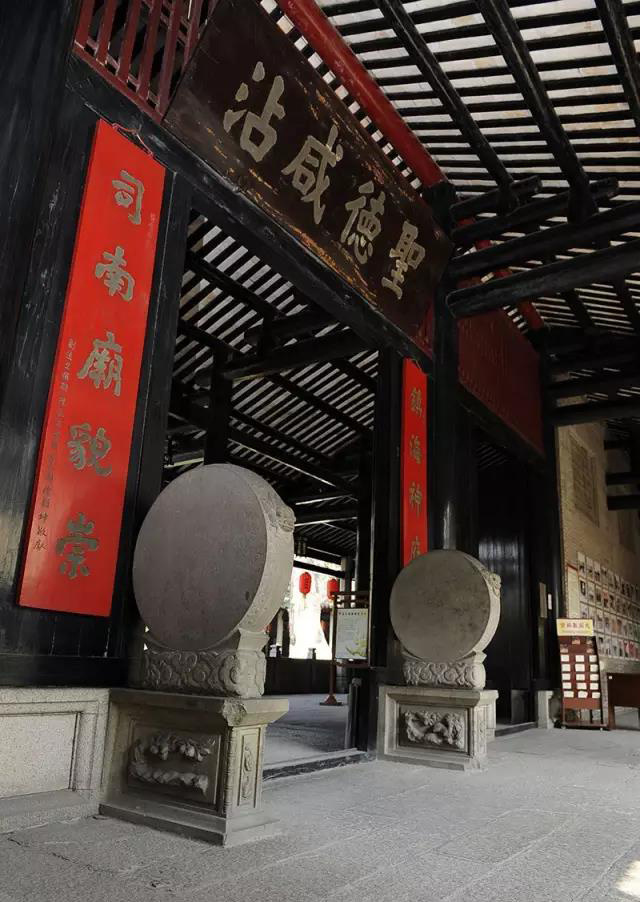 仪门,是礼仪之门,分为中间大门和侧门。中门只供高官贵族进出,其他官阶低的官员或普通人只能走侧门。仪门上方是刻有“圣德咸沾”的横匾,对联是“镇海神休永,司南庙貌崇”,体现了人们对南海神高尚美德的崇敬。
