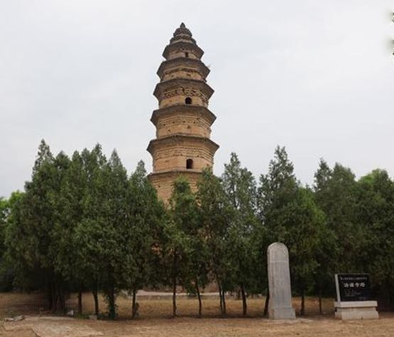 法源寺塔,位于陕西省渭南市富平县美原镇西寺小学内(法源寺故址)。塔为唐高宗咸亨二年(671年)建置美原县后所建,距今已有千年历史,曾多次修葺。法源寺塔塔高约20米,壁厚1.75米;为楼阁式七级八角中空花塔,青砖砌筑,仿木结构,塔刹样式别致,犹如一口小钟端放在塔顶,插莲瓣于钟上,小巧玲珑;塔身叠涩出檐,四面镶有浮雕石刻佛像,工艺精湛,别具特色;塔身三层以上,留有修补痕迹,一二层表层砖块已有剥蚀脱落现象;整体塔身稍微向东南倾斜,塔体有裂缝。