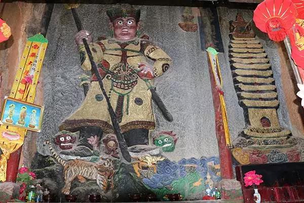 细看石刻造像,天王头戴宝冠,身披甲胄,面目狰狞;左手叉腰,右手持三叉戟,腰间左右佩双剑;左脚踩龙,右脚踏虎,龙周围饰云水游鱼,足外侧各置一骷髅,两脚间有宝珠形饰物。石刻造像一侧刻有大小塔各一座,小塔高0.95米,托以卷云纹,大塔高4.8米,在小塔与大塔之间,有“大圣毗沙门天王”字样。整个摩崖石刻为浅浮雕,雕刻技法粗犷。1983年,北方天王石刻造像被昆明市人民政府确定为市级文物保护单位。