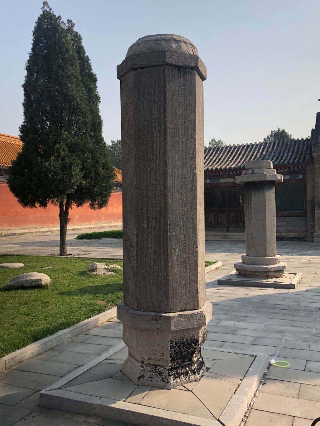 西岳庙《太华山记》石幢由座、身、顶三段组成,身为八棱柱形。顶压八角形石盘一层,石盘上压圆形覆盆莲花,下部为须弥座,束腰,浮雕仰覆莲花两层。
