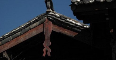 纳西族民居的山墙多数为悬山式,两边是封檐裙板及封山板,既保护外露的檩条,又起到了装饰效果。纳西族人认为“悬鱼”是“吉庆有余”的象征,因此在封檐板正中会设计朴实、美观的“悬鱼”,式样根据建筑的等级、性质、规模质量而定,基本形式为直线和弧线。