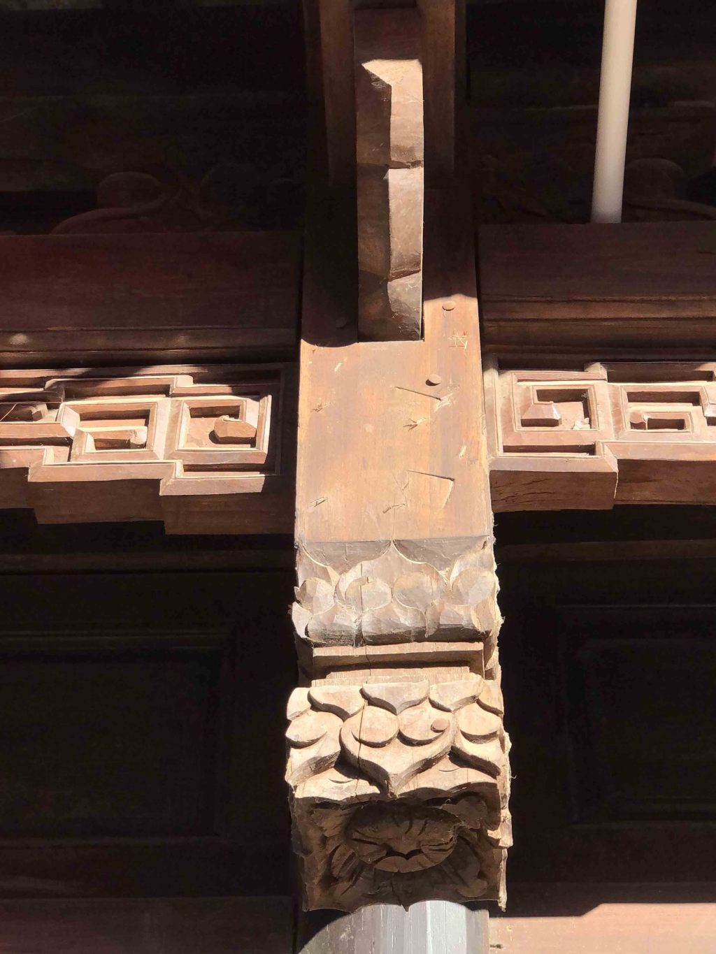 “一颗印”民居建筑的精美木雕结构集中于门、窗、梁、枋等部位。如:雀替能减少梁枋的跨度,防止构架倾斜,起到支撑建筑檐与椽之间承受力的作用;梁多为抱头梁,常见兽头、荷花装饰;穿插枋多是凤凰与花草图样;随梁枋则多为透雕花草、鸟兽、几何纹饰。