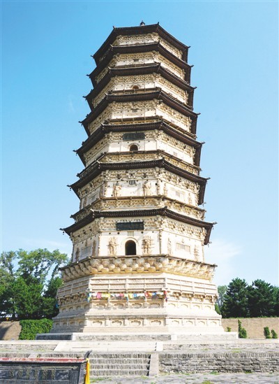 白塔名为万部华严经塔,是辽代华严宗佛寺的一座藏经塔,因为塔身涂了白垩土,通体洁白,故俗称白塔。塔通高55.6米,为八角七层楼阁式砖塔,基座砌莲瓣、平座栏杆和束腰,具有辽代佛塔的典型特征。辽代佛教文化非常发达,修建的佛塔数量很多,中国北方地区现存辽代佛塔百余座。部分辽塔破损严重,内蒙古自治区赤峰市武安州辽塔的保护问题,就引起了国家重视,而万部华严经塔是现存辽代佛塔中保护较好的一处。