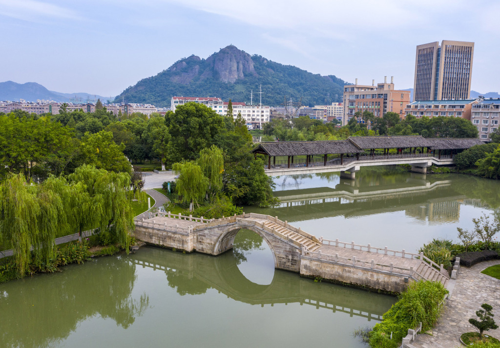 在浙江省温岭市城东街道湖心公园内,有一座单孔石拱桥,石拱桥将湖心公园两个小岛相连,又与廊桥相对,颇具江南水乡风韵。夜晚亮灯后的桥,和水中的倒影构成一牙“弯月”,像极了它的名字——月洞桥。