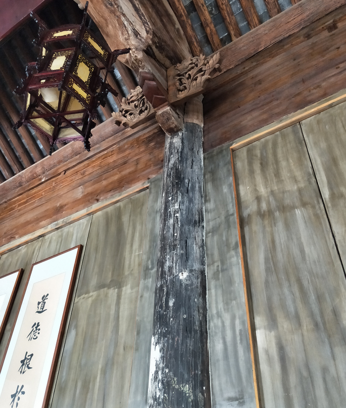 贞和堂正厅保留有明末清初时期的木柱,且大部分保留较好。四根金柱表面有牢固的地仗,甚至保存大面积的黑色大漆,经过三百多年的时间考验,仍旧保持着当年的卓越品质,手感细腻,色彩深沉,遗存的油漆实物,对今后研究传统油漆工艺,以及文物保护工作具有十分重要的意义。