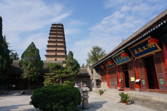 善导(613 —681年),俗姓朱,山东临淄人,被称为净土二祖。抄有《阿弥陀经》数万卷,绘“净土变相”300余壁。其《观经四帖疏》于8世纪传入日本,日僧法然据此创立日本净土宗,广为流传。善导灵塔、供养塔均始建于永隆二年(681年),一说供养塔建于神龙二年(706年)。现存为供养塔,原为方形十三级,1979年整修时,残存十一级,残高33米。底层每边长9.5米,高约5.5米;以上各层高度骤减,层间叠涩出檐,施两排菱角牙子。塔壁仿木结构,每面均作三间,以砖隐出倚柱、阑额及斗栱。各层均当心间辟券门,次间施朱绘直棂假窗。底层南门额刻“涅槃盛事”四字,系乾隆年间添置。关于善导塔旧貌,宋明两代文人笔记有“中多石像,塔砖中裂”和“寺塔中裂,院宇荒凉”等记载,可见塔身“中裂”现象延宕近千年之久。整修时弥合裂隙,做了钢筋混凝土内框架,并逐层做了塔体内圈梁和外腰箍(隐蔽处理),在增强抗震能力的同时,保持了“残存十一级”的旧状。