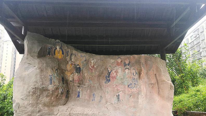大溪口石刻造像原位于巴州区回风管委会八村二社大溪口巴河南岸观音殿崖面上,2020年4月搬迁至北龛景区。该处造像分布面积为6.6平方米,刻有人物图像50余身,内容分上下两层,画面中央为普贤菩萨结跏趺坐于六牙白象上,普贤周围有众菩萨和天龙八部围绕,下为礼佛仪仗图,均为浅刻,线条流畅,人物形象飘逸。此处造像保存完好、色彩绚丽,在四川上千处石窟寺及石刻中没有与之相同者,具有较高的历史、艺术价值。