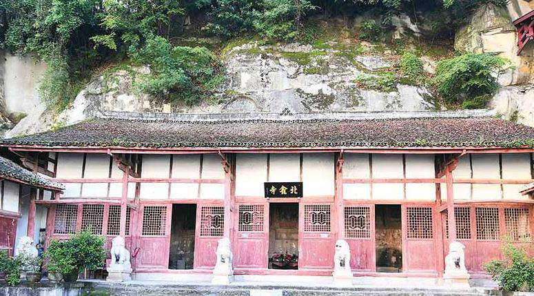 从仿古建筑山门沿着石梯而上,进入视野的是一个三合院布局的清代建筑,正殿沿着崖面而建,左右厢房向南延伸,正殿廊道狮子、象石雕柱础托起的廊柱证明了古寺的久远。据史料记载,北龛寺建于唐代,现存建筑建于清代,主梁上还清楚地记载了它的具体年代,原为四合院建筑,前面的戏楼于20世纪60年代拆除,窟前建筑和左右厢房保存完整。曾经,巴州城东、南、西、北石窟均建有寺庙,东、南、西石窟、寺庙建筑在不同历史时期被损毁,北龛石窟完整地保留了窟前建筑和左右厢房,对研究宗教信仰和庙宇建筑有着重要的历史价值。同时,北龛石窟大部分造像位于寺院建筑内,对造像起到了很好的保护作用。