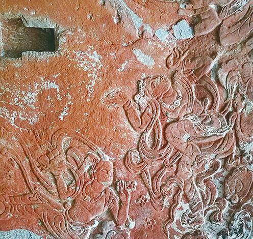 走进北龛石窟,还能欣赏到各种传统乐器,伎乐女神彼此配合,相得益彰,仿佛那浑然自成的动人音律就在耳旁。北龛的伎乐大多雕刻在龛楣、佛座、正坛壸门处,7号、14号龛楣雕伎乐像,伎乐有弹琵琶、吹笛、击腰鼓等,无论演奏什么乐器,其演奏的姿势都有独特的美感。在北龛石窟中,琵琶通身呈梨形,伎乐“犹抱琵琶半遮面”,线条流畅优美。吹笛伎乐神态祥和,眉目低垂,笛轻轻放在美人嘴边,气息变化自如,手指灵活起舞,仿佛笛音飘然而出,悠游柔转。鼓是整个乐舞中的节奏灵魂,在北龛石窟中也能看到,瞧,淋漓酣畅的敲打仿佛把我们带进了一场盛大的音乐盛会,享受古典音乐大餐。