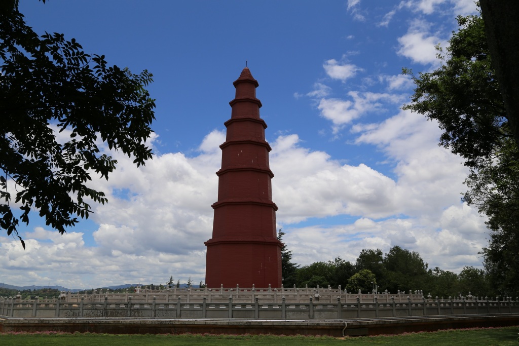 玉溪红塔建于元代,清道光十九年(公元1839年)重建。塔身用青石条砌成,是八方七级实心密檐式的一座石塔。塔高25.09米,塔座由露出地面的两级台阶组成。第一级高0.35米,第二级高0.20米。塔身第一层每方长3.5米,周围28米。由下至上,逐级收缩,逐级减低。