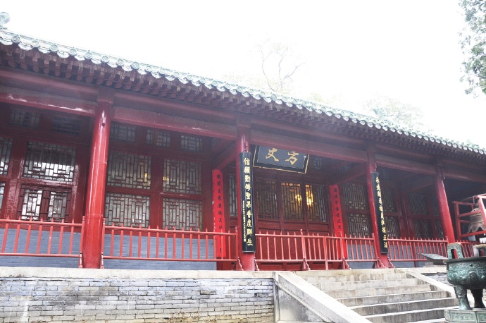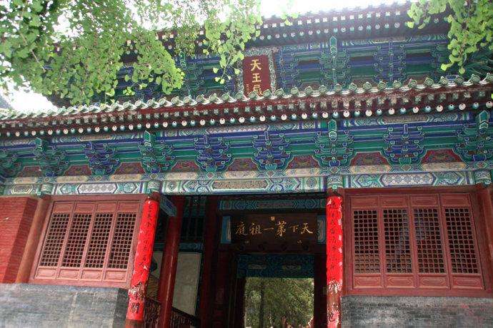 少林寺山门就是少林寺的大门,是一座面阔三间的单檐歇山顶建筑。它坐落在两米高的砖台上,左右配以硬山式侧门和八字墙,整体配置高低相衬,十分气派。门额上的“少林寺”三个大字是大清康熙皇帝亲书,上有“康熙御笔之宝”方印一枚,更为寺院增添一道辉煌的风景。