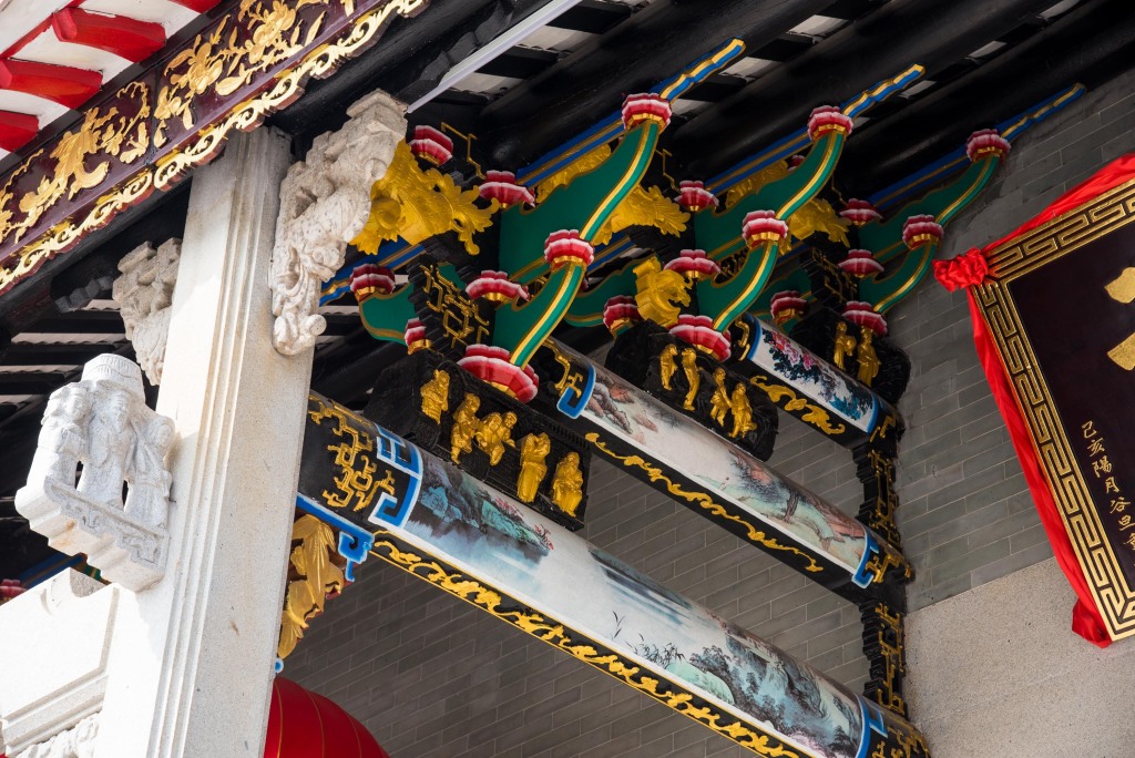 步入祠堂可以看见,头门采用花岗岩墙基及门框,虾公梁、檐柱两侧均有花鸟纹花岗岩斗拱承托檐檩,前廊三步梁,木雕人物故事装饰驼峰,花岗岩方身檐柱、包台。在祠堂的几个门口,都有用古脊刻画文房四宝、松鹤等花样,寄托好读勤学的美好愿景。