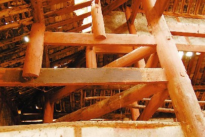 怀着几分警惕,记者跨进庙内。呵!庙内原只有一层,一厅两室,典型的木式穿榫结构。房屋起主要承载作用的,是正厅两侧的柱头,一侧两根,高约10米,直径约40公分。横梁、柱头相互穿连着,使房屋的架构极为牢固。