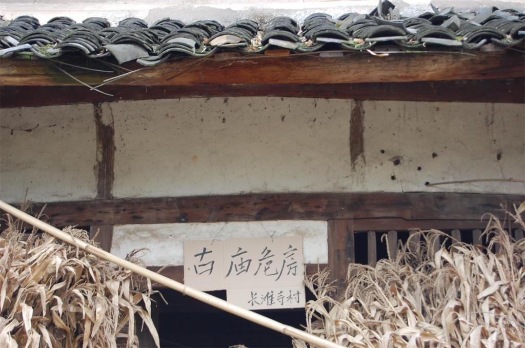 古庙门口的檐下堆满了柴草,门口上悬着一块纸板,上面写着长滩寺村委的提示:“古庙危房。”