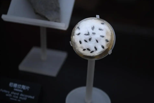 余姚市河姆渡遗址博物馆内陈列展示的出土稻谷(来源:新华社)