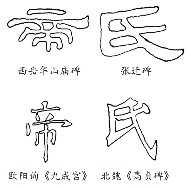 首先,由于楷书的基本点画比隶书多而其形态又与隶书异趣,于是造成了多数字在间架体势上的差异。比如隶书以突出横画为主,并且其主要横画与右斜勾同用波磔向右(或右上)方出锋收笔,这就自然形成隶书取横势、多呈扁平之形的间架结构;楷书则因字而异,不一定突出某个方向的笔道,并且横画无论突出与否,结收均顿笔作下垂之势(与隶书波磔呈上扬之势相反),右斜画改用斜勾或捺,于是自然形成楷书取纵势,多呈长方之形的间架结构。试看“帝”“氏”二字楷书与隶书的结体(见下图),隶书“帝”字,第一笔以横代点,第二笔长横用波磔,着意突出横画取横势,故写成“头重脚轻”之形倒反别致;“氏”字突出斜向波磔且坡度很小,加上隶书中横撇和挑笔每与横画无别,遂有三横并施,以形成横飞之势方为美。楷书则不然,“帝”字改第一笔的横为竖点,并突出下部中间的竖画,还要讲求上下均衡;“氏”字楷书把原来的三横改变成一撇、一横、一挑,用斜勾取代了原来的波磔,且斜勾的坡度加大。这样一来,这两个字的身体自然要“抽条”变高,以取直立纵势为精神。所以楷书的间架,首要考虑的是能不能“立住”的问题。