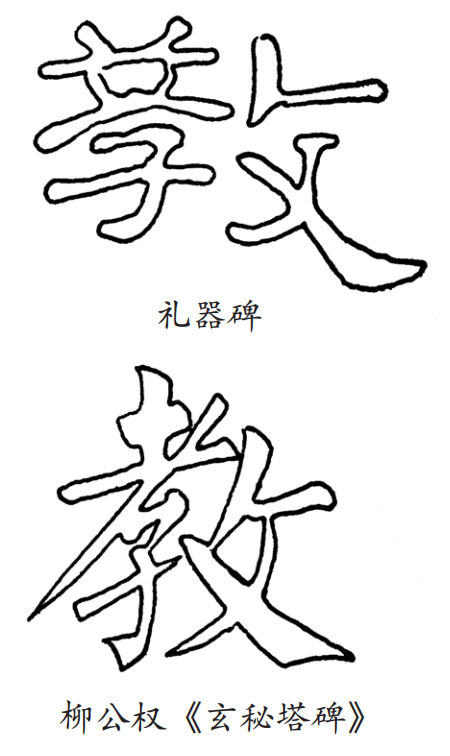 其次,楷书间架结构的整体意识比隶书明显而强烈。在对待由两个或两个以上的“文”(独体字)组合成的合体字的结构处理上,楷书与隶书有明显的不同。隶书沿袭古文字(篆书)的习惯,往往不改变组成合体字各“文”的原本形状而直接拼合;楷书则绝不允许这样,它很强调局部服从整体。因此,要求进入“合体”的各“文”,为了使自己的“集体”能团结成一个“人”一样,不仅随时准备改变自己的形貌(原来点画的正斜、留放等有改变),而且彼此之间的位置、占地比例以及相互的依赖和点画的呼应等,都要受到严格的约束。也可以说,楷书在进行艺术结体时,不再把进入“合体”的各部分视为独立的“文”,而只把它们当作已分解开来的具体点画来安排。这样,楷书的合体字便不再是机械的拼合,而是有机的化合了。试举“教”为例:隶书教字左旁的“孝”与独立的“孝”字无别;楷书“教”字左右两部分不仅明显改变了原来的形貌,而且彼此相向依附,融为一体,上下左右点画之间的迎来送往照应之情也十分外露。整个字所有点画的伸缩聚散、平直斜正都服从于一个整体,都拱奉着一个中心。