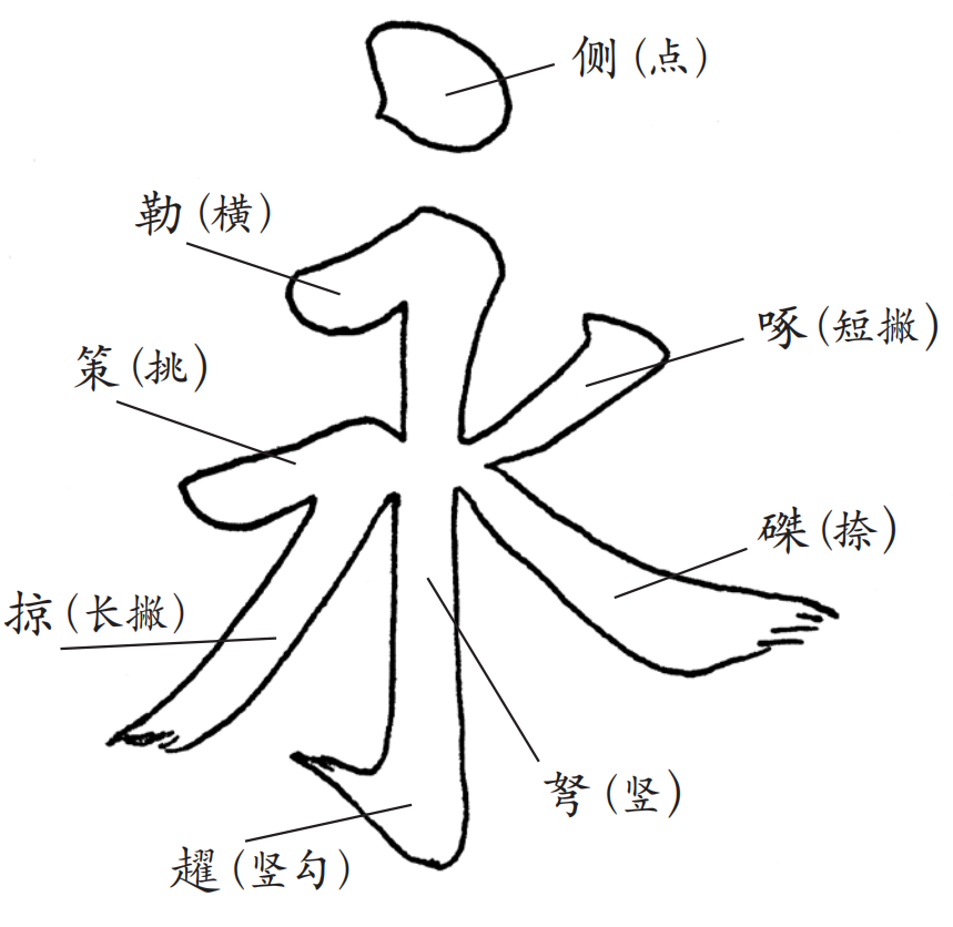永字八法是古人以永字为例,概括地阐述楷书八种基本点画用笔要点的方法。关于它的来源,历来说法不一,大约是在楷书盛行的隋唐之际,书家为指导初学者习书,便取被誉为“天”的王羲之《兰亭序》的第一个字“永”为例,总结出一套欲以简驭繁、“以开字中眼目”的教学方法。在永字八法中,点叫作侧,横叫作勒,竖叫作弩,竖勾叫作趯,挑叫作策,竖撇叫作掠,横撇叫作啄,捺叫作磔。点画的命名虽然很奇特,但寻其字义,皆暗含比喻,说明该点画应如何写才能得其骨力、神韵。下面我们顺次试作简要的说明。