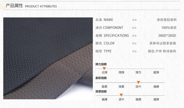 在多种箱包面料中,涤纶牛津布结实耐用,弹性好,不易变形,耐腐蚀,易洗快干。这种面料的旅行箱包质量轻,价格便宜,外观设计变化大,容量的弹性也较大,成为旅行箱包面料的最佳选择。