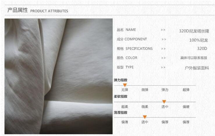 320D尼龙塔丝隆冲锋衣、登山服、户外运动服面料,320D尼龙塔丝隆冲锋衣登山服户外运动服面料,100%尼龙材质,平纹组织,通过染色工艺处理,面料轻薄、防水透气性能极好。