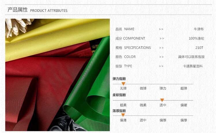 户外野营帐篷布料,采用100%涤纶材质,1.5米幅宽,克重54g/㎡,密度210T,纱支150D*150D,有红色、浅绿色、绿色、军绿色、桔色、酒红色等颜色可选,防水性能极佳。